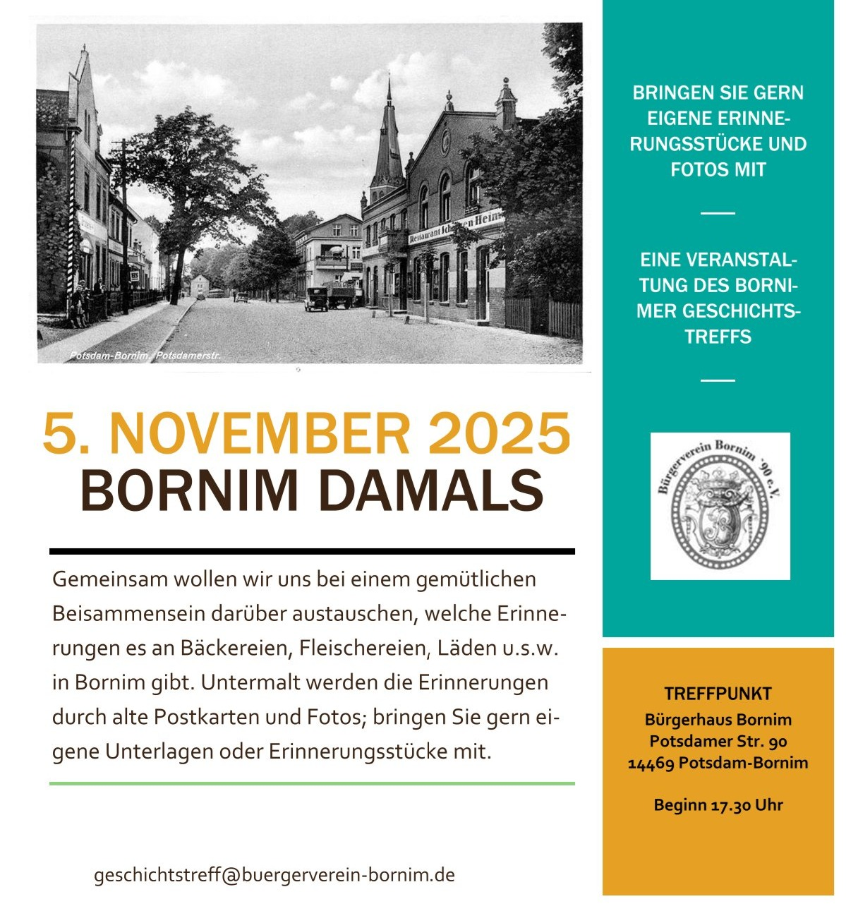 Gemeinsam wollen wir uns bei einem gemütlichen Beisammensein darüber austauschen, welche Erinnerungen es an Bäckereien, Fleischereien, Läden U.s.w. in Bornim gibt. Untermalt werden die Erinnerungen durch alte Postkarten und Fotos; bringen Sie gern eigene Unterlagen oder Erinnerungsstücke mit.